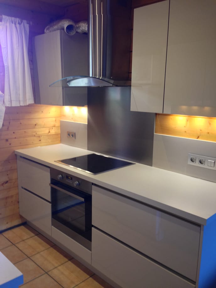 • La cuisine est équipée de nombreux rangements et de grands plans de travail pour vous permettre de préparer vos repas. Le style contemporain et la couleur gris claire se marient aux surfaces en bois clair pour ajouter une touche chaleureuse et traditionnelle, rappelant l’ambiance savoyarde.