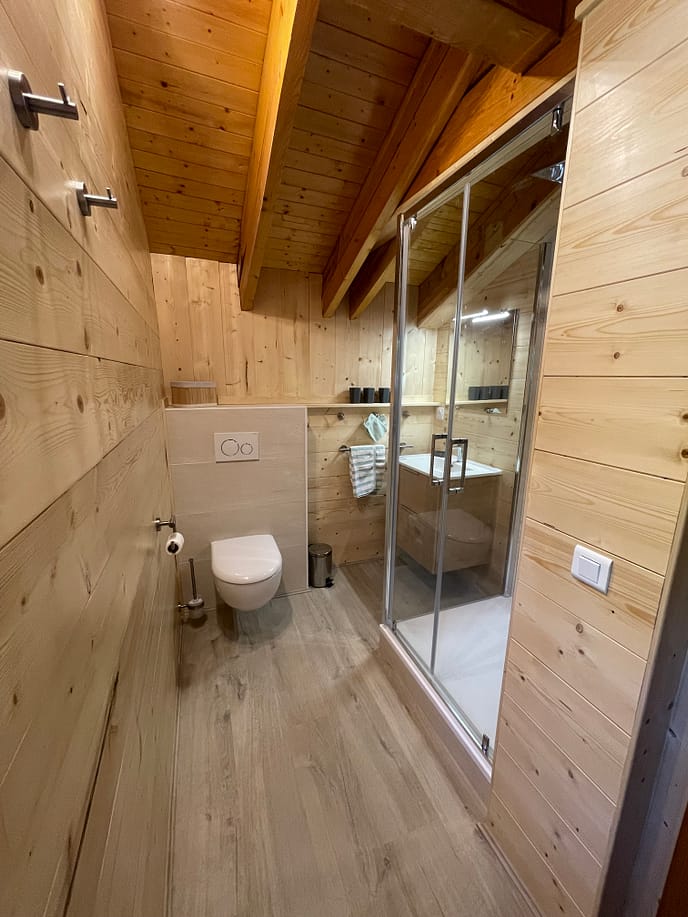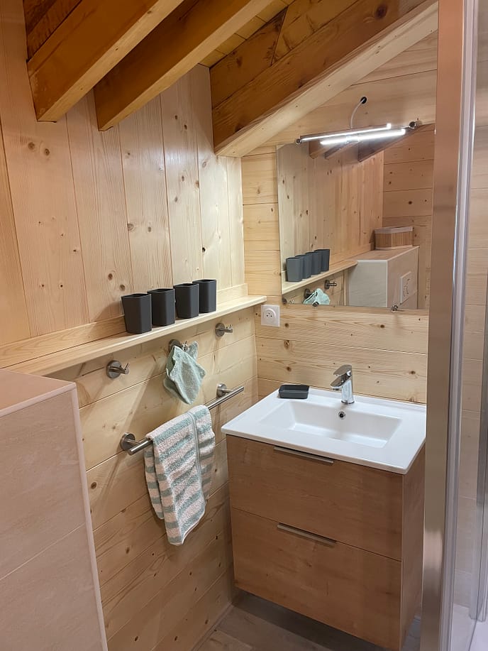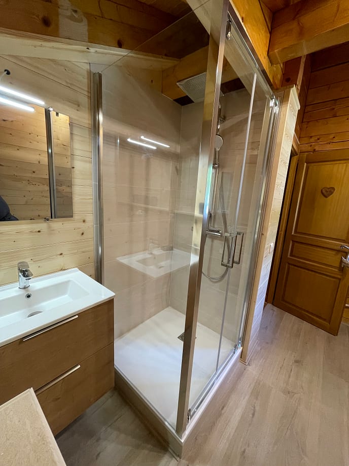 Elle est équipée d’une douche spacieuse à parois vitrées avec une robinetterie thermostatique, douchette et douche de pluie, offrant une expérience relaxante après une journée en montagne. Le meuble lavabo en bois clair s’intègre harmonieusement aux murs en lambris naturel, apportant une touche authentique et chaleureuse. Vous y trouverez également des rangements pratiques pour vos affaires de toilette, ainsi qu’un miroir éclairé pour plus de confort.