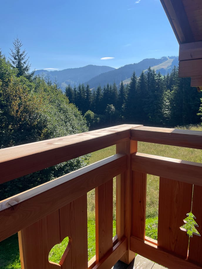Elle donne directement sur un balcon, qui offre une vue spectaculaire sur le Mont-Rond et la chaîne des Aravis.